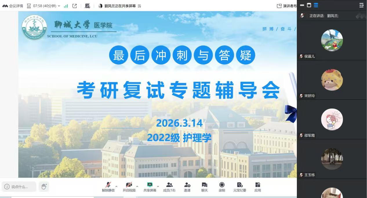 为帮助护理学专业考研学子精准把握2026年考研复试核心要点,破解备考难题,提升复试竞争力,护理学教研室于3月14日晚19点在腾讯会议举行考研复试专题辅导会。本次辅导会由护理学教研室教师刘凤兰主持、王玉栋担任主讲人,护理学教研室副主任侯丹华出席会议,全体护理学专业考研学子参会,共同为复试备战充电蓄力。