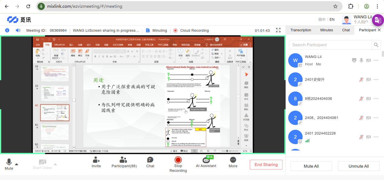 王丽结合自身临床诊疗与科研项目经验,从现实需求出发,用通俗的语言阐释临床科研在医疗创新、个人成长与行业进步中的核心价值,让同学们明白科研能力是医学从业者的核心竞争力之一。她围绕临床研究的完整流程展开讲解,从临床问题提炼、科研选题思路,到队列研究、病例对照研究等不同类型的适用场景,再到样本量估算、数据收集规范,用卵巢癌预后分析、吸烟与疾病关联等真实案例拆解关键环节,让抽象的科研方法变得直观易懂。课堂上,她还耐心解答同学们关于“零基础如何入门科研”“如何平衡临床与科研”等疑问,分享入门科研的实用路径,建议大家从精读文献、参与回顾性研究起步,逐步搭建数据积累与科研协作的基础,鼓励同学们在临床观察中发现问题、在实践探索中锤炼能力。整堂课程逻辑清晰、案例鲜活,互动氛围热烈,为同学们构建起系统的临床科研知识体系。同学们纷纷表示,此次课程收获颇丰,学习厘清了临床科研的入门思路,解决了科研起步阶段的诸多困惑。